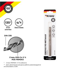 Сверло по металлу 8мм "Кобальт" (сталь HSS-Co 5% M35 P6M5K5) DIN 338 (блист.1шт) Kranz KR-91-0510