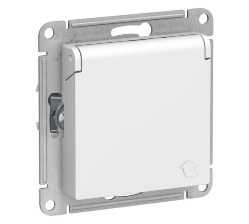71Механизм AtlasDesign (цвет белый) розетки одинарной с заземлением, шторками и крышкой подходит для сетей 250 В, на ток 16 А.