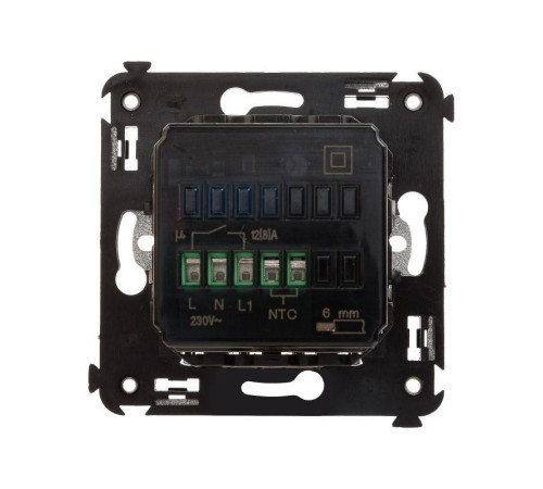 230 В ACТермостат для теплых полов. Назначение: для монтажа в подрозеточные коробки глубиной не менее 45 мм (код 59301);. Предназначен для управления теплыми полами. Характеристики: диапазон от 5 до 30 °С; частота – 50–60 Гц; номинальное напряжение – 230 В; лампа-индикатор включается, когда температура в комнате падает ниже выбранного значения; нагрузка: 5 A – cos?=1, 2 A – cos?=0,4; фиксация в подрозеточные коробки глубиной не менее 45 мм при помощи каркаса с лапками (код 4400802) и саморезов; провод датчика температуры в комплекте (длина 3,5 метра). Цвет: "Ванильная дымка".
