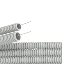 17Гофрированные трубы из полиамида рекомендуется прокладывать в пустотах фальш-полов и фальш-потолков, по несгораемым и трудносгораемым основаниям (открыто), а также внутри корпусов оборудования и по ним. Трубы устойчивы не только к воспламенению, но и к воздействию ультрафиолета, а потому для их прокладки не надо организовывать особые условия, чтобы защитить их от воздействия солнечных лучей. Номинальный диаметр 17 мм (это означает, что внутренний диаметр трубы - 16,8 мм, а наружный - 21,2 мм). Специальная протяжка, входящая в комплект, облегчает прокладку кабеля по трубе. Цвет трубы - темно-серый. Герметизация до IP67.