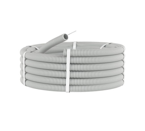 20Гибкая гофрированная труба из ПВХ надежно защищает кабель от механических воздействий. Используется для прокладки электрического, компьютерного телефонного кабелей. Труба этого типа прокладывается в стенных штробах, в пустотах фальш-потолков и фальш-стен, в стяжке полов или под фальш-полами. Проволочная протяжка облегчает прокладку кабеля в трубе. Диаметр - 20 мм. Материал – самозатухающий поливинилохлорид (ПВХ). Цвет - серый. Гофрированные трубы из ПВХ легкой серии могут эксплуатироваться при температуре от – 25 °C до + 60 °C. Длина – 100 метров.
