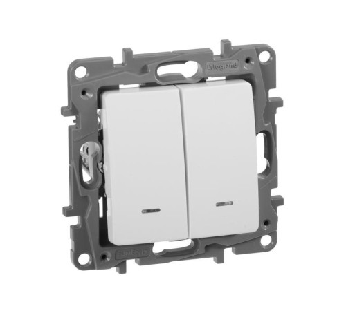 44Выключатель с подсветкой двухклавишный Legrand Etika для скрытого монтажа, номинальный ток 10 А, цвет белый. Предназначен для управления двумя электрическими цепями.