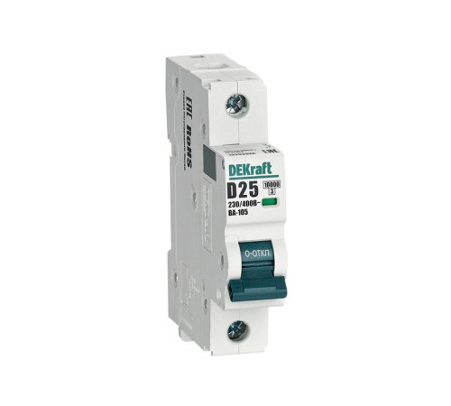 1Автоматический выключатель серии ВА-105 DEKraft; 1P; ном. ток 25 А; характеристика D; откл. способность 10 кА; ширина модуля 18мм. Аппараты имеют механизм мгновенной коммутации, 6 монолитных заклепок, которые повышают прочность корпуса. Боковые каналы охлаждения повышают стабильность работы при высоких температурах окружающей среды. Есть возможность установки дополнительных аксессуаров с левой стороны устройства. Аппарат на 100% совместим с корпусами и оболочками DEKraft и Systeme Electric.