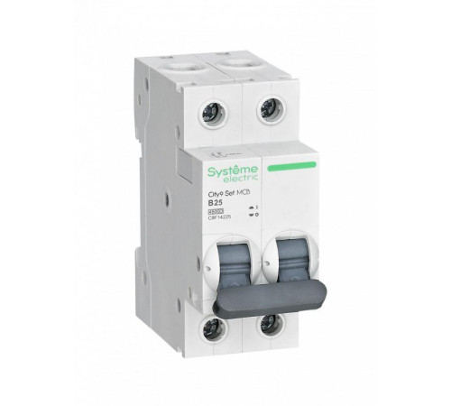 4.5Автоматический выключатель серии City9 Set Systeme Electric, 2-полюсный, номинальный ток 25 А, характеристика B, Icn = 4.5 кА. Применяется в электрических сетях напряжением 230 В. Предназначен для защиты от перегрузок и токов короткого замыкания. Оснащен механизмом «мгновенной коммутации». Ударопрочный корпус из специального пластика с 6 металлическими заклепками. Безопасные клеммы исключают попадание кабелей в заклеммное пространство.