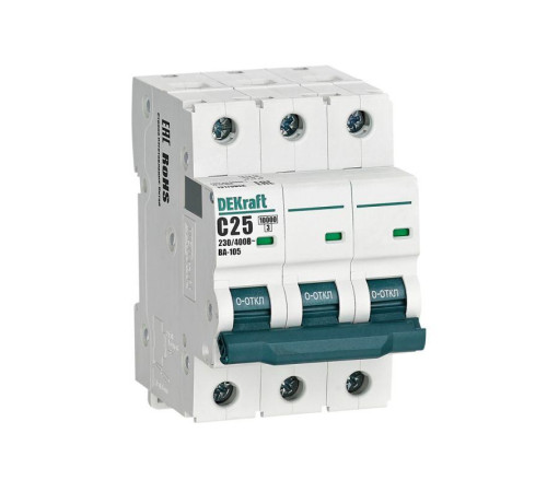 25Автоматический выключатель серии ВА-105 DEKraft; 3P; ном. ток 25 А; характеристика C; откл. способность Icn = 10 кА; установка – на DIN-рейку; ширина – 3 мод. х 18мм. Преимуществом выключателей ВА-105 является их высокая механическая и электрическая износостойкость — в 20 000 и 10 000 циклов соответственно. Аппараты ВА-105 имеют возможность применения независимых расцепителей на переменный и постоянный ток, а также возможность установки устройств на аппараты гребенчатых шин типа PIN.