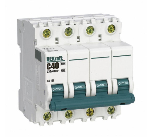 4Автоматический выключатель серии ВА-101 DEKraft; 4P; номинальный ток 40 А; характеристика С; отключающая способность 4,5 кА. Новый механизм расцепления мгновенно разрывает цепь при возникновении аварии. 5 монолитных заклепок повышают прочность корпуса аппарата. Сплошная лицевая панель обеспечивает безопасность эксплуатации аппарата. Боковые каналы охлаждения повышают стабильность работы при высоких температурах окружающей среды. Полностью автоматизированный контроль качества производства.