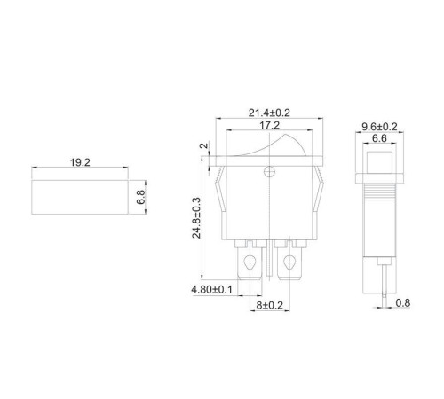 ПлоскаяВыключатель клавишный 250V 6А (2с) ON-OFF черный Mini предназначен для коммутации электрических цепей переменного тока напряжением до 250В. Клавишные (Рокерные) выключатели применяются в качестве комплектующих изделий различного электрооборудования (в сетевых фильтрах и удлинителях, аудио-оборудовании, блоках питания, электроустановках на различных производствах, автомобилях, и многих других местах). Такой клавишный переключатель имеет два положения. Принцип действия основан на перемещении клавиши в одну из позиций. Для переключения в нужное положение требуется приложить некоторые усилия на клавишу. Монтаж осуществляется без применения винтов на плоских панелях толщиной от 0.8мм до 3мм. Подключение контактов осуществляется плоской клеммой, либо с помощью пайки.