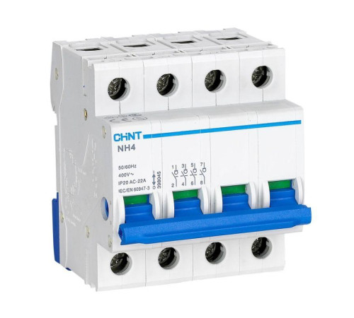 и административных зданий, а также в промышленности. Модельный ряд данных выключателей нагрузки рассчитан на номинальные токи до 125 А. За быстродействие в изделии отвечает механизм мгновенной коммутации. Выключатель NH4 оборудован специальными контактами, которые позволяют использовать для уподключения шины типа PIN и FORK, что добавляет возможность удобного подключения. Электрическая стойкость изделия к износу составляет 1500 циклов, а механическая стойкость - 8500 циклов.